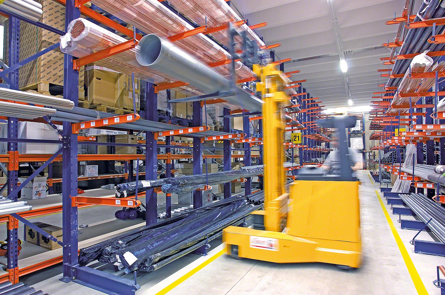 懸臂式貨架立柱多采用H型鋼或冷軋型鋼,懸臂采用方管、冷軋型鋼或H型鋼,懸臂與立柱間采用插接式或螺栓連接式,底座與立柱間采用螺栓連接式,底座采用冷軋型鋼或H型鋼。貨物存取由叉車、行車或人工進行。貨架高度通常在2.5米以內(如由叉車存取貨則可高達6米),懸臂長度在1.5米以內。